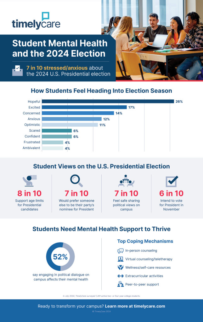 “While the upcoming U.S. Presidential election is a significant source of stress for many students, it’s encouraging to see that a majority feel their candidates care about the issues that matter to them. This sense of hope amidst the anxiety highlights the importance of providing robust mental health support during such pivotal times,” said Dr. Jerry Walker, Executive Director of Mental Health Services for TimelyCare.