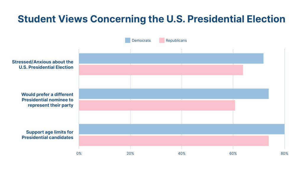 Concerns about the candidates varied based on political party affiliation. Students who affiliate with the Democratic party reported more anxiousness about the election (72% vs. 64%), were more likely to prefer a different Presidential candidate to represent their party (74% vs. 61%), and were more likely to support age limits for presidential candidates (80% vs. 74%).